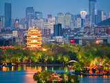 在大明湖北岸向东眺望,近出是湛蓝的湖水和古韵味浓的超然楼,远处是高度近400米的在建超高层建筑绿地山东国金中心,两座相隔约6公里远的地标性建筑“同框”。